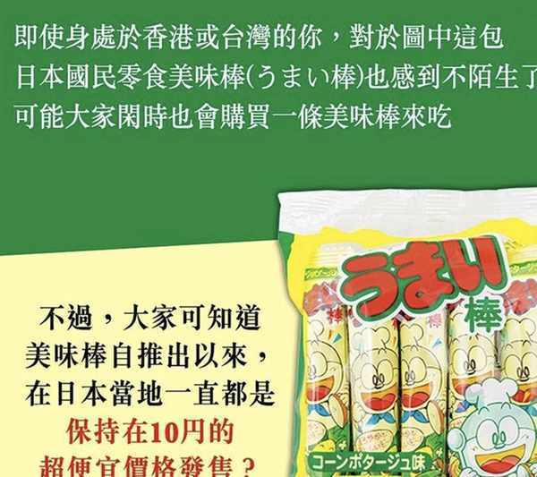 ?不僅僅是零食或許你會覺得這麼多年都過去瞭,哪裡還會有如此便宜的零食,但是還真的有,而且跨度更大,四十餘年的時光,足以跨越兩代人的光景,這就是一款日本的小零食美味棒瞭。