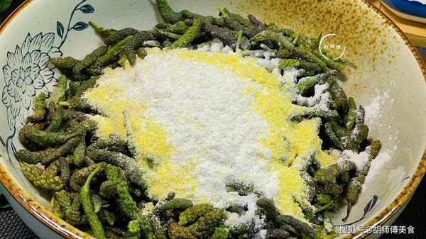 2、將構樹穗放入到盆中,然後淋上一勺食用油到構樹穗上拌勻,接著再把玉米粉、面粉、食鹽、十三香、胡椒粉全部拌勻。大傢拌構樹穗時,一定要記得先放一勺食用油,這樣不僅可以使構樹穗更好的沾上粉,而且還能防止構樹穗蒸的過老。