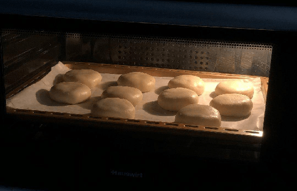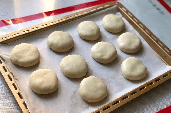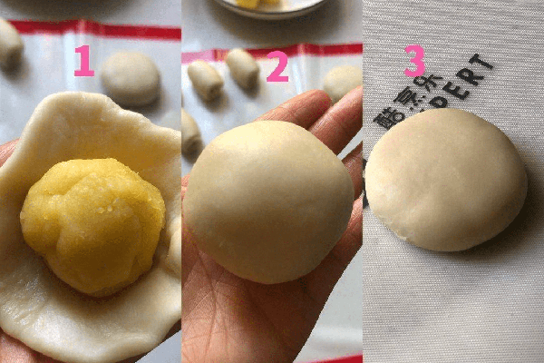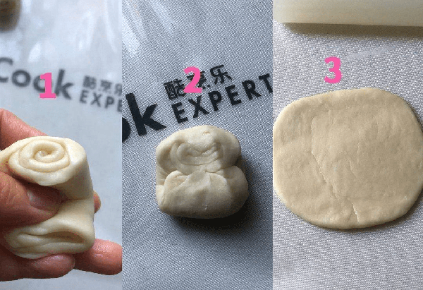 步驟二十三:拿一個面團,中間壓一下,按扁,搟成圓形