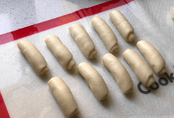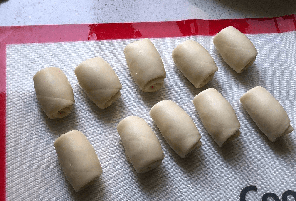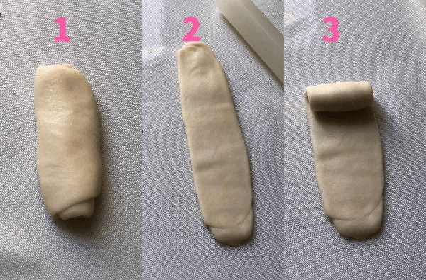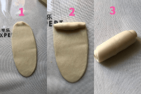 步驟二十一:接著再次搟,壓扁,搟成長型,自上而下卷起來