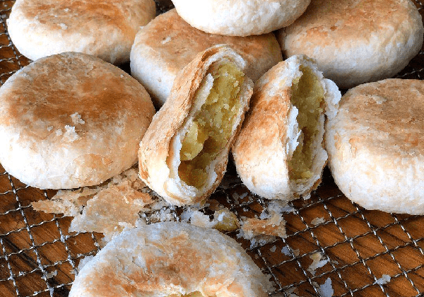 步驟二十四:接著包綠豆餡,包好後,壓扁