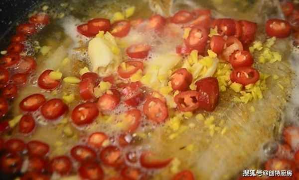 3、加入薑蒜、紅辣椒,倒入一罐啤酒,再來點白開水烹煮;