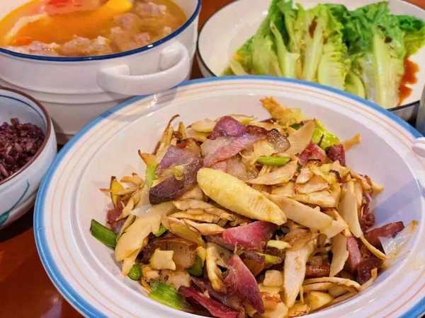 春筍炒臘肉,筍與臘味是民間常見的食材,每年三四月,浸染春雨而出土的春筍最是金貴,配著年節剩下來的臘腸臘肉,這道細火爆出的經典佳肴,不僅入口爽滑,肥而不膩,而且味極甜美,搭配米飯最為適宜。這一咸一鮮的搭配,其實有講究。春筍、咸肉,均是營養豐富的食材,配合默契,各司其職。