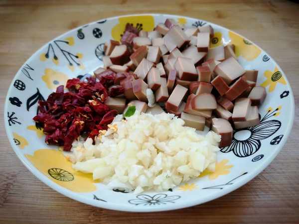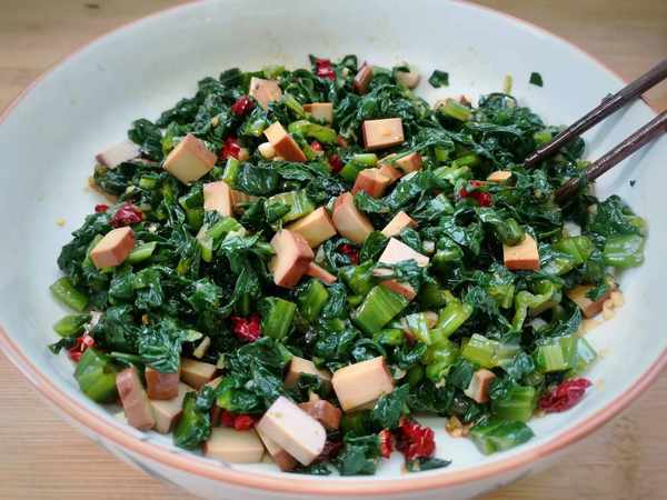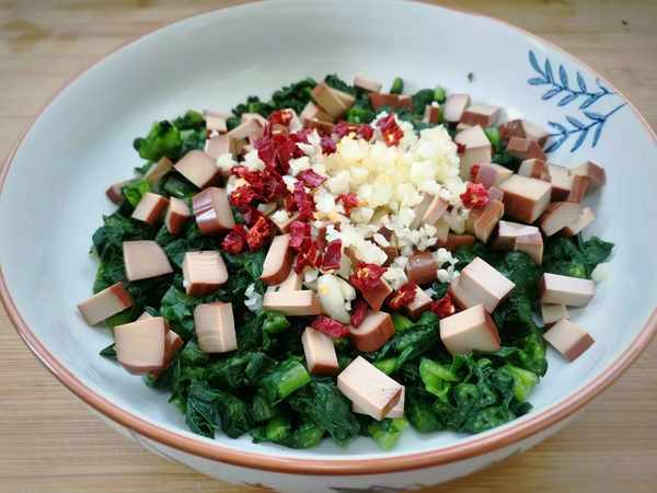 食材:萵筍葉、雞蛋幹、大蒜、幹辣椒、生抽、香醋、香油 、糖、鹽。