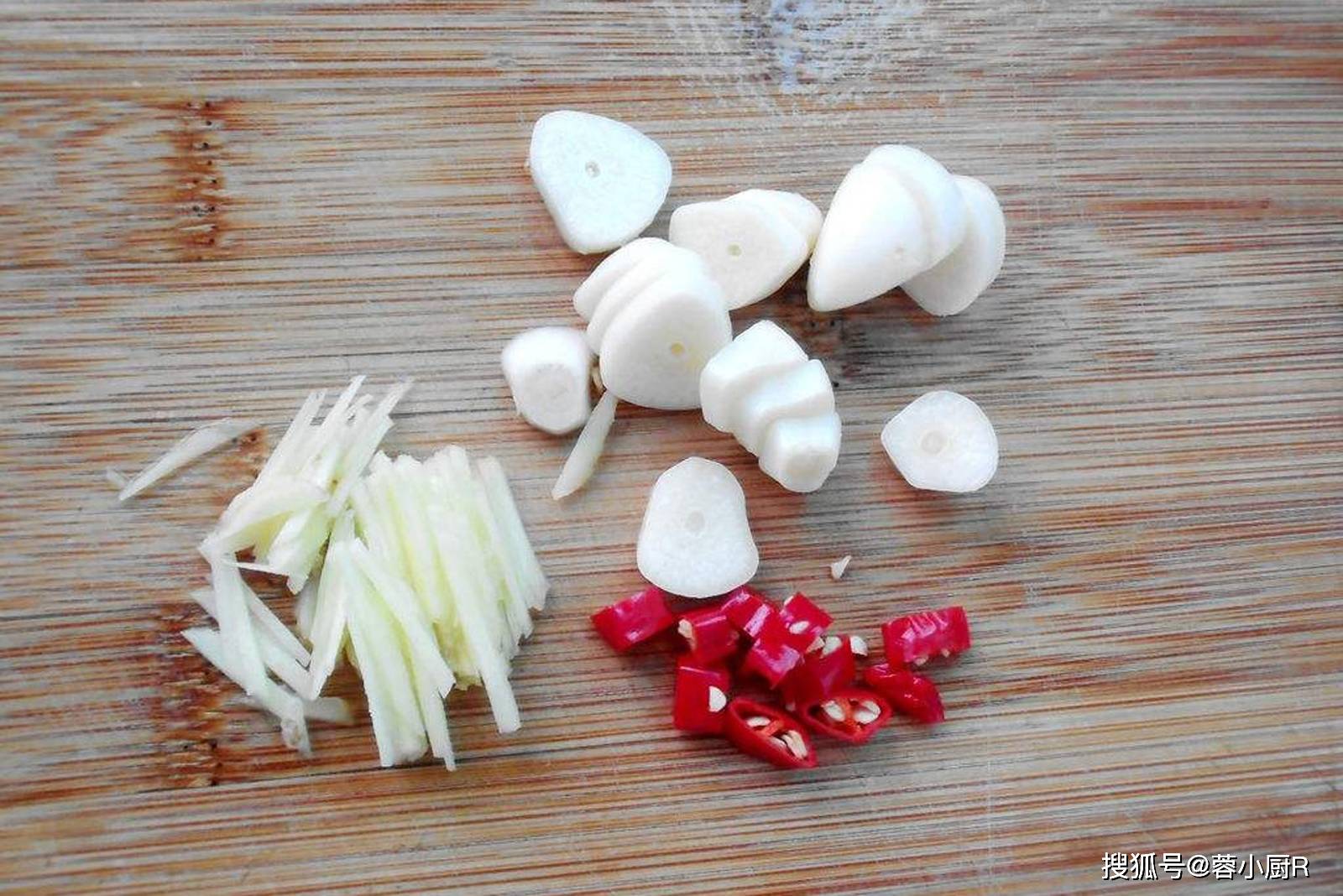 2、花生泡好後再來切點蔥薑。生薑一塊,削皮切片;小蔥一把,洗幹凈後打3個蔥結。