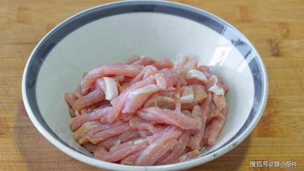 11、再準備200克瘦肉,切肉絲後裝入碗裡,加鹽,胡椒粉,料酒,淀粉水抓勻,最後再加一勺食用油拌勻後醃制10分鐘。