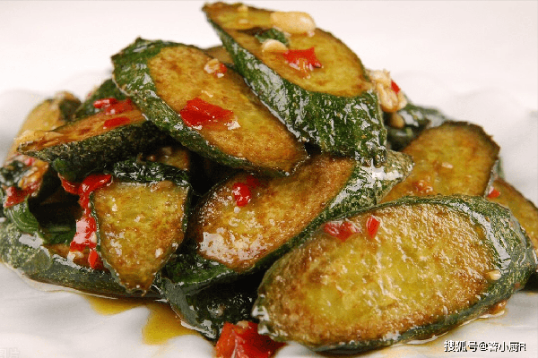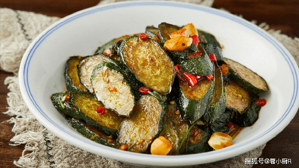 4、起鍋熱油,倒入黃瓜煎,2-3分鐘左右倒入蒜末和小米辣翻炒出香味兒。