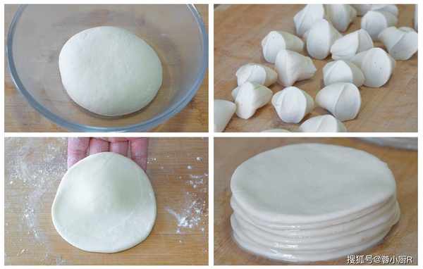4、面劑子切好後撒點幹面粉防粘,然後用手掌壓扁後就可以搟面瞭,先豎著搟一下,轉90度後繼續搟一下,搟成比餃子皮稍微大一點的面皮就可以,我們先把這些餃子皮依次搟完。