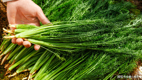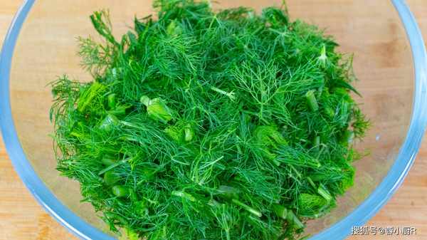 5、新鮮的茴香葉一把,先清洗幹凈,然後晾幹水分。接著切成小段兒後裝入碗裡,加一勺熟的食用油、或者是香油,拌一拌可以防止出水。