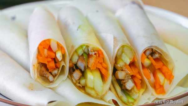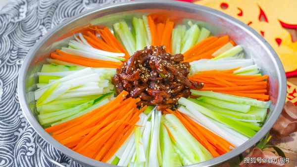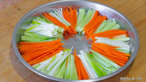 10、春餅一般用來包各種菜和肉來吃,下面我們就來準備一些,黃瓜胡蘿卜先切段兒再切條,大蔥切絲,切好後先擺盤。