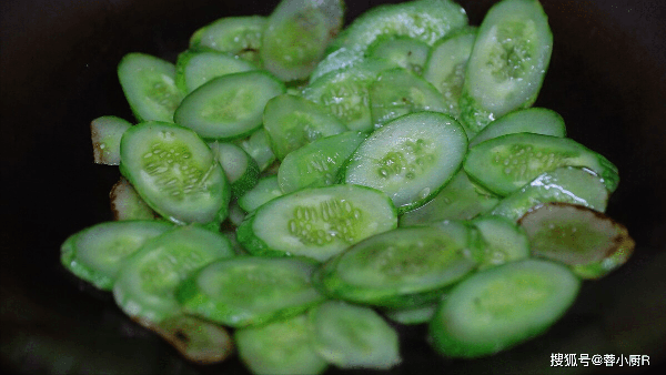 5、黃瓜要煎至微微發軟倒入紫蘇,然後開始調味,放入生抽,蠔油,糖和鹽,翻炒均勻即可。