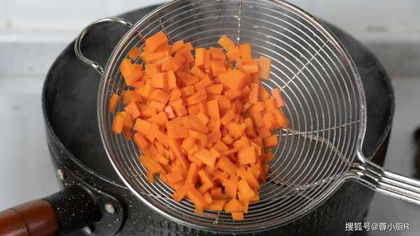 6、胡蘿卜半根,洗凈後削皮,然後再切成小丁。起鍋燒水,水開加一勺鹽、然後把胡蘿卜丁倒進來焯水,大火煮2分鐘後撈出來瀝幹水分放涼。