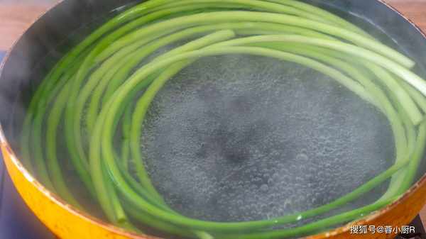 2、鍋中放水,加1勺鹽和1勺油,水開後放入蒜苔焯水,一分鐘就差不多瞭。