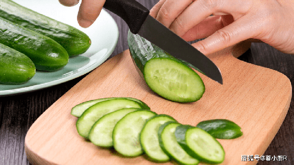 1、黃瓜1條,洗凈後瀝幹水分,然後切片,要比平時切的厚一點。