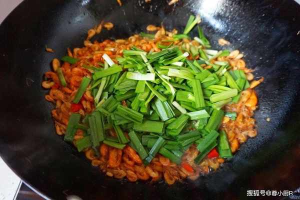 4、鍋中倒油燒熱,放入薑絲、蒜片炸出香味,然後撈出來,倒入河蝦翻炒,變色後放入韭菜、朝天椒、鹽,大火翻炒一分鐘左右,韭菜易熟,不要翻炒時間過長。出鍋裝盤享用!