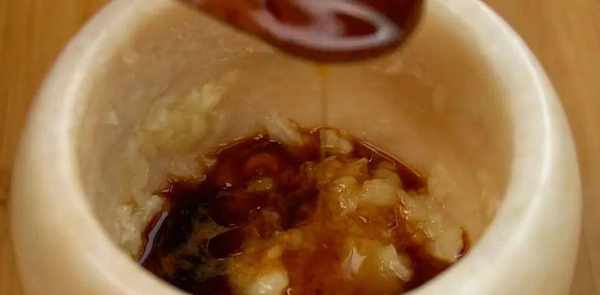 3、把菜均勻地鋪在籠佈上。我們再來調個料汁,把蒜倒在蒜臼裡,加點鹽,搗碎。再加入兩勺生抽,一勺香油水攪拌均勻。