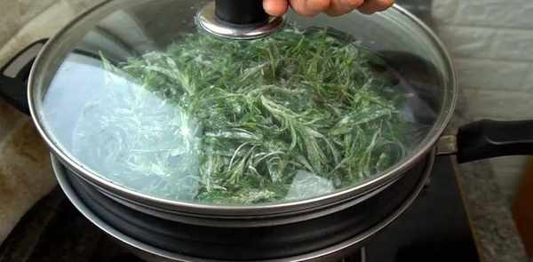 2、我們把這個摘好的掃帚苗,給它清洗兩遍。鍋中加水燒開之後加食用油,然後放入掃帚苗,加色拉油是為瞭保持這掃帚苗的綠色,以防顏色流失,燒開就可以瞭,我們撈出,大傢看一下是不是顏色特別的翠綠啊,再把掃帚苗過下涼水撈出放入大碗裡。