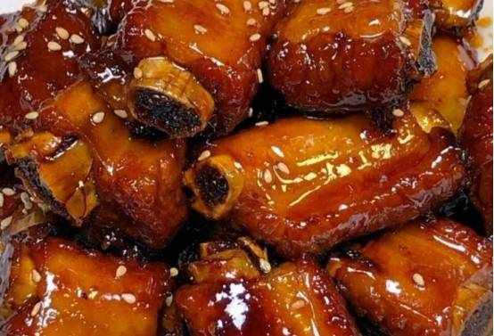 食材:排骨、糖醋汁、薑、蔥、鹽、冰糖、料酒、生抽、老抽、白芝麻