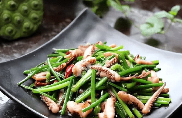 步驟三:鍋中燒熱油,爆香之後,下入魷魚段翻炒,炒至微微變色,下入韭菜一起翻炒,炒至韭菜成熟變軟,下入食用鹽,味素,調味即可。
