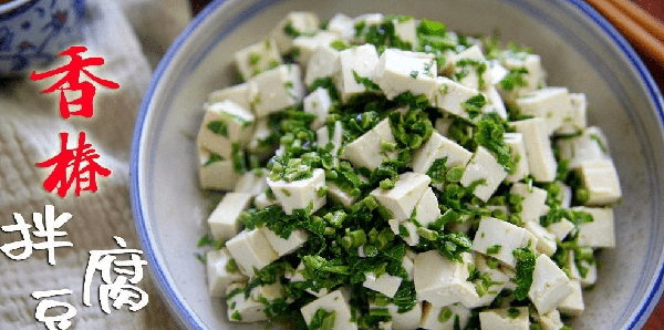 步驟二:豆腐改刀切成小塊,將香椿碎與豆腐放進一個盤子中。