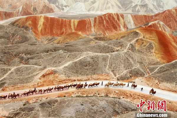仿古駝隊重走絲綢之路途經張掖丹霞地質公園。成林 攝
