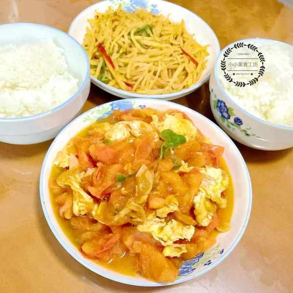 番茄炒蛋和酸辣土豆絲,應該不用多說瞭,國民級的下飯菜,隨便一炒都好吃,為瞭讓大傢炒出更美味的菜品,小小分享幾個小經驗,一是炒雞蛋的時候,可以在蛋液裡加點清水或淀粉水,這樣炒出來的雞蛋會更加軟嫩,二是炒土豆絲的時候,一定要大火爆炒,這樣做出來的土豆絲才爽脆可口。