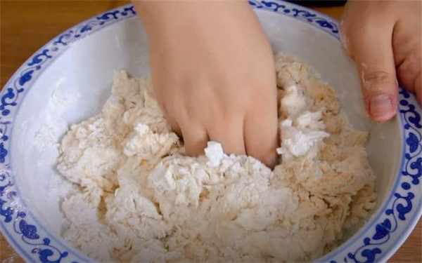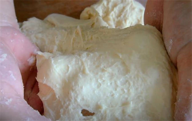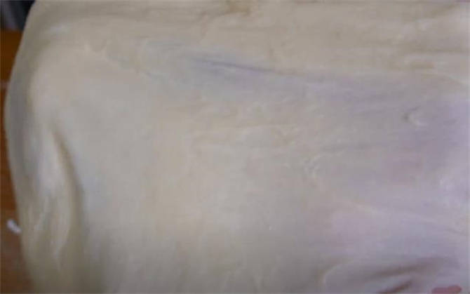 2.表面少撒一些幹面粉,然後簡單的揉成團,按照洗衣服的方式開始推拉揉搓,像這樣能扯出厚膜的時候咱們放黃油。