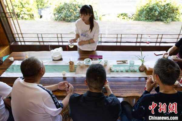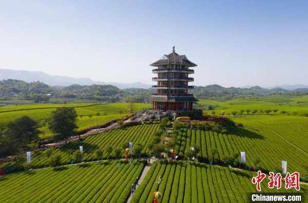 4月16日,遊客在遵義鳳岡茶海之心景區品茗。 田成 攝