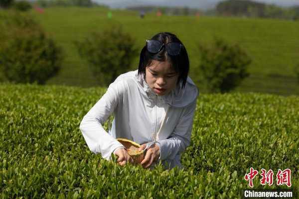 4月15日,遊客在遵義湄潭永興鎮萬畝茶海景區體驗采茶。 田成 攝