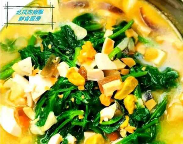 2 起鍋燒油,下咸鴨蛋,皮蛋丁爆香,加入開水,放入豌豆苗,加鹽,雞精,各一勺,調味,煮5分鐘即可,湯鮮味美,營養豐富。
