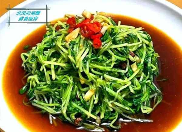 所需食材:豌豆苗,蒜,小米辣,鹽,雞精,白糖,生抽,香油,醋