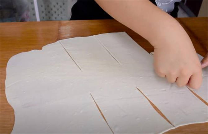 5.把這一塊面劑揉圓,揉好之後按扁,搟成一張圓形的餅皮,現在咱們開始做層次,依次向裡疊加起來。