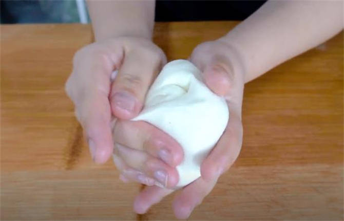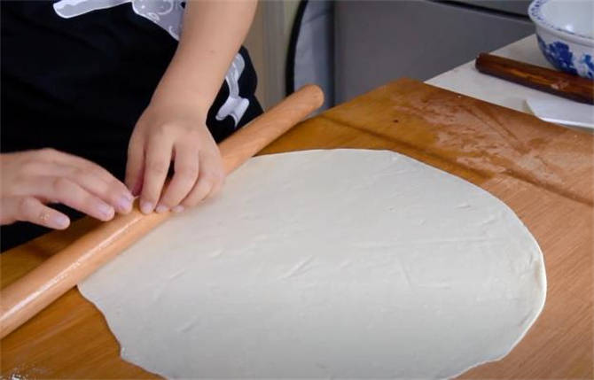 8.收口處朝下按扁,搟成一張圓形的餅胚,把餅胚卷起來。