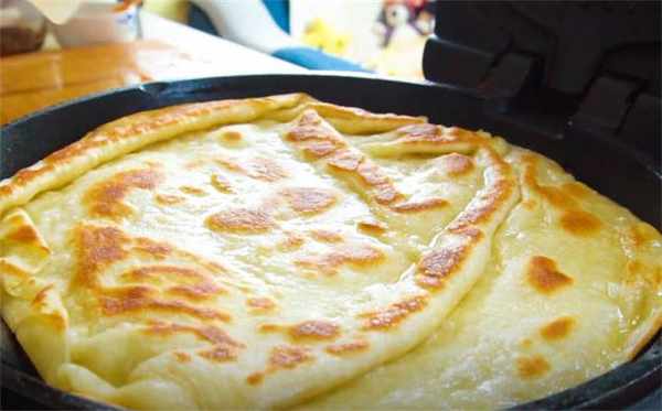 9.電餅鐺預熱好刷油,把餅胚放進去,拉出褶子,表面再刷上一些油,蓋上蓋子上下火一起烙,烙瞭大概兩分鐘,電餅鐺呼呼冒熱氣,咱們給它翻個面,再烙兩分鐘咱們翻個面,開始刷醬瞭。