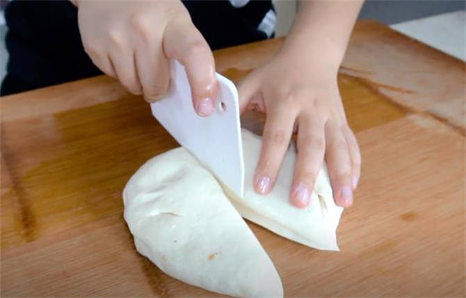 4.時間差不多到瞭,咱們的面也餳好瞭,案板上先刷一些油防粘,切兩半。