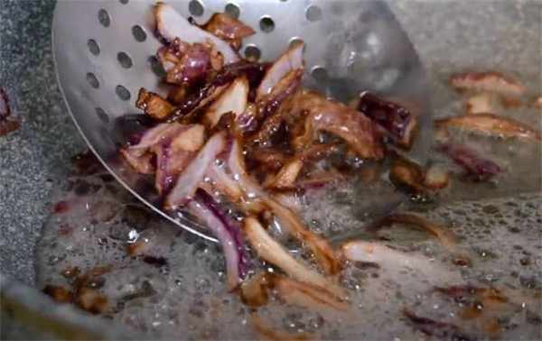 2.鍋裡先倒一些油,油稍微有點熱的時候放一些洋蔥,把洋蔥炸成這樣的焦黃色,出來洋蔥的香味就行瞭,咱們用漏勺把它撈出來。