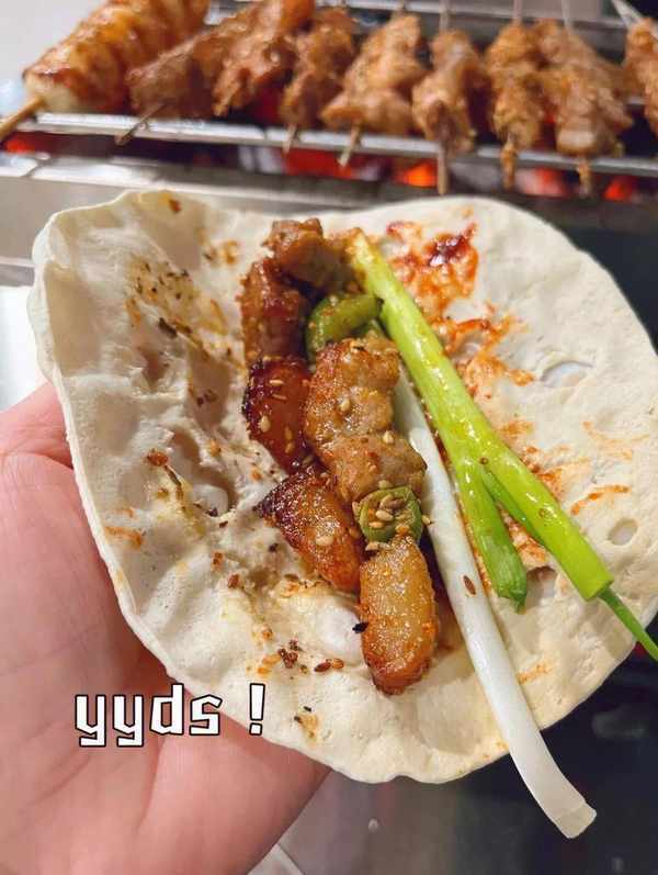 在這裡,“小餅卷一切”,食客們平鋪小餅,加上小蔥和肉串,三位一體,一口下去,口感豐富,這正是淄博燒烤的過人之處,不同於其他燒烤的食用方式。