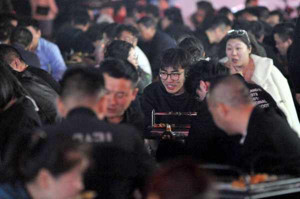 4月14日晚,淄博燒烤攤,眾人正在吃燒烤。(新華社發 劉一鳴 攝)