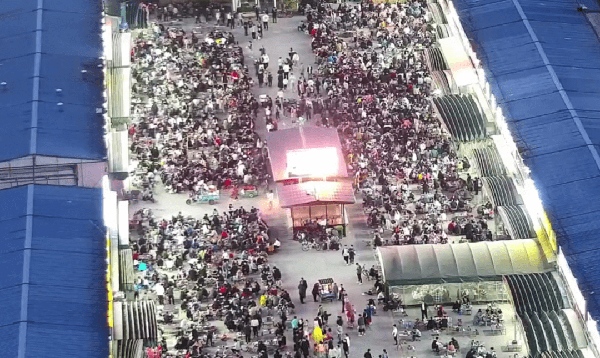 4月14日,夜幕降臨,前來淄博臨淄大院吃燒烤的人越來越多。(公共視頻截圖)