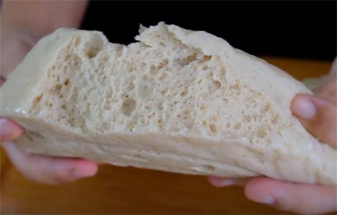7.這個面筋能炒著吃燉著吃煮著吃,現在咱們就簡單的拌一下,做一個涼拌面筋,看這裡面的氣孔特別的飽滿,再橫著切成面筋塊,這次咱們先吃這麼多,這些吃不完的,直接把它曬幹,或者是放冰箱冷凍,可以保存一個月。