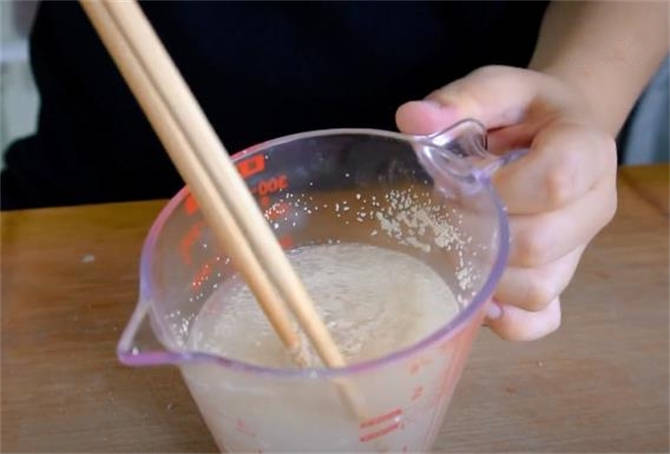 1.我這是290g溫水裡面加瞭3g的酵母粉,咱們把它攪化開。
