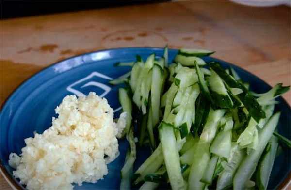 4.這個時間咱們切一下蔬菜,我們傢調涼菜,這個黃瓜和大蒜是少不瞭的,切點黃瓜再打點蒜蓉。