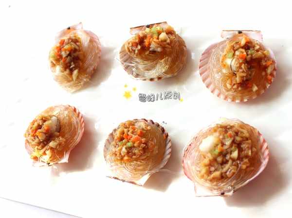 1,扇貝用牙刷乾淨,把扇貝掰開成兩片,把扇貝肉的內臟去掉,扇貝殼洗淨備用,粉絲泡軟。