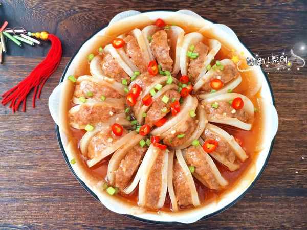 蒸牛肉蘿蔔做法:所用資料:牛肉餡適量,白蘿蔔1個,醬油,葱末,薑末,鹽少許,澱粉少許。