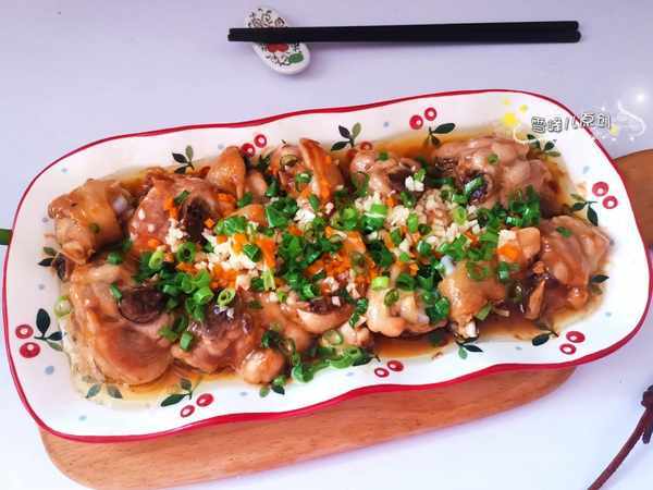 3,把雞腿上面加上蒜末,小葱末,胡蘿蔔末,潑上少許熱油即成。