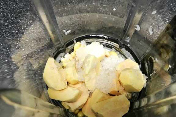 步驟二:把紅薯去皮切成小塊,和黃豆、大米、果仁一起放進破壁機裏;