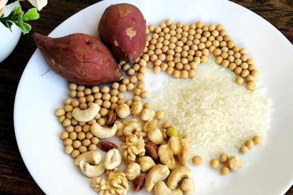 需要的原料:紅薯120g、幹黃豆40g、大米30g、多種果仁30g、清水適量;