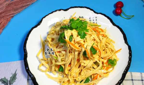 4、將豆油皮絲放入大碗裡,放入胡蘿卜和香菜段。如果有香椿苗可加入一些味道會更好。