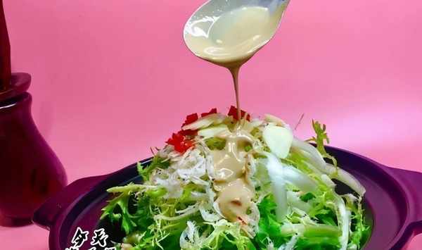 7、均勻地淋上麻醬汁,撒上紅椒粒即可。
