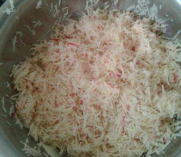 我們需要找來一個非常大的容器,倒入一半的淀粉和面粉,最後加入適量的溫水,把我們剛才做好的蘿卜和粉條放到這個容器當中要進行攪拌均勻,再加入適量的鹽和13香進行調味,把鍋放到火上鍋中放入適量的油,等到油溫達到五成熱的時候,我們把蘿卜做成丸子的形狀,放到油鍋中油炸,最後等到丸子炸成金黃色的時候,就可以把這些丸子都給撈出來瞭。